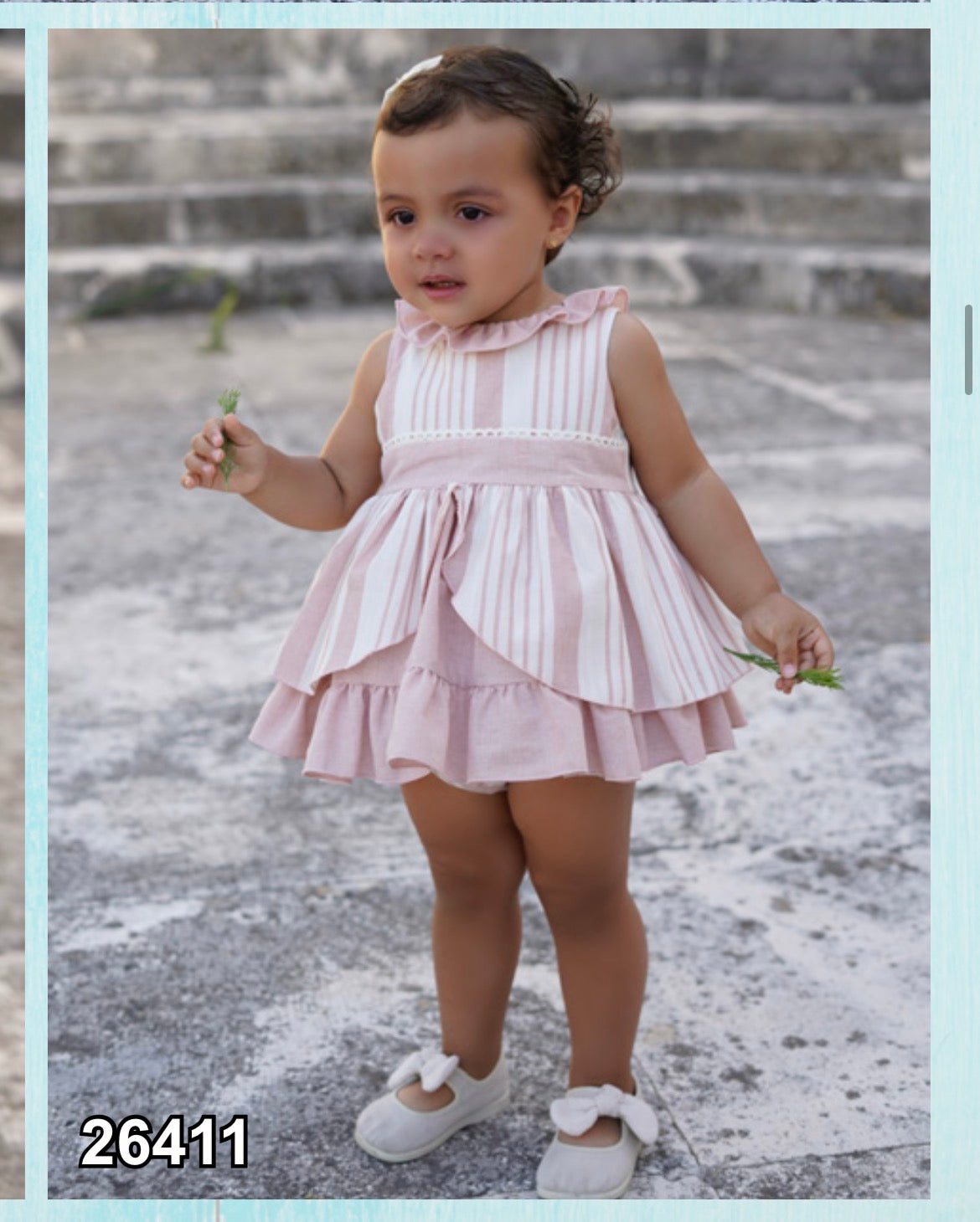 Tejido y Color: Confeccionado con rayas verticales en tono rosa palo o maquillaje combinado con blanco. El tejido parece tener una textura natural, similar al lino o algoDon