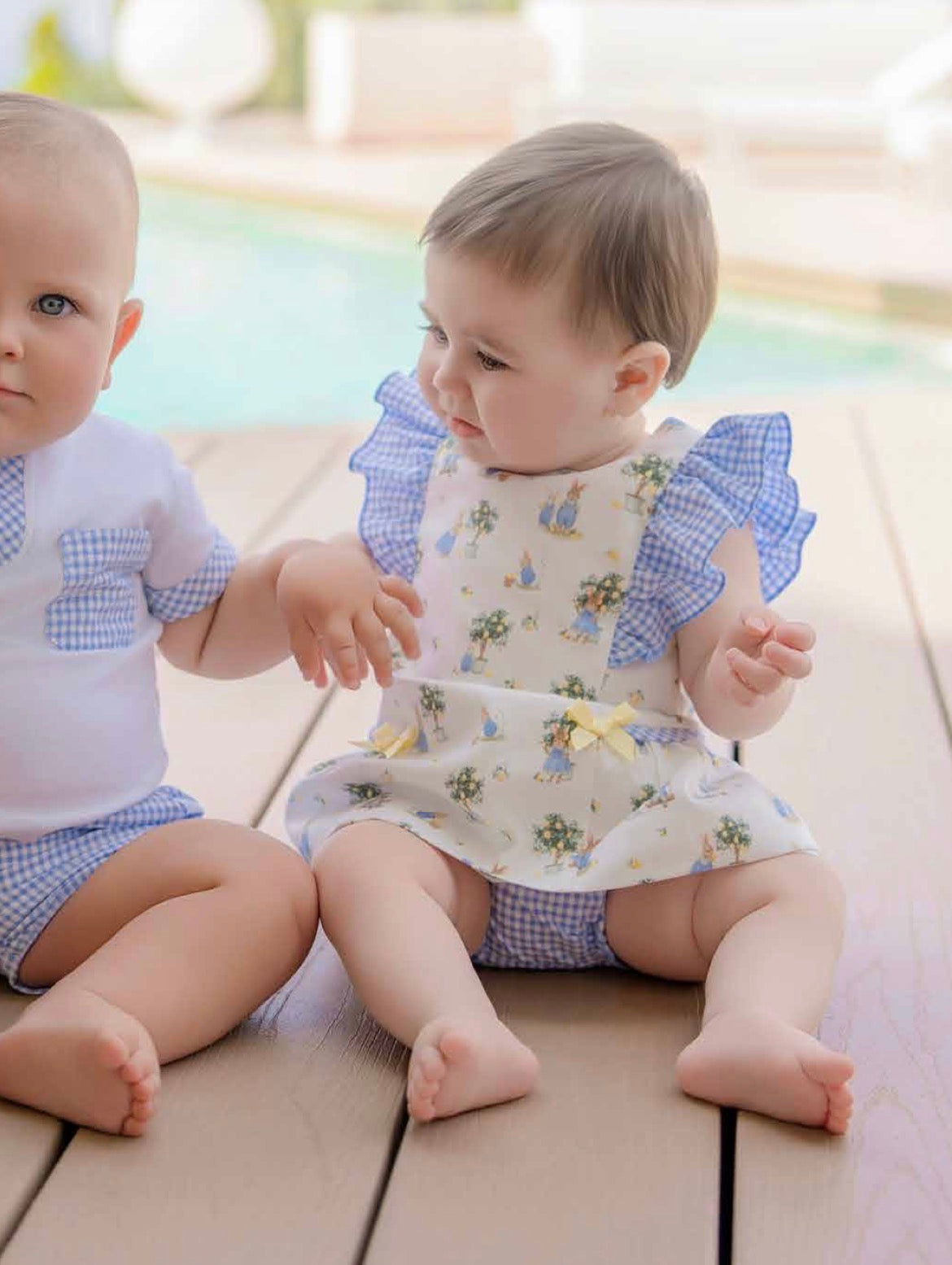 Conjunto de vestido y braga, con ribete en cuadro Vichy, azul y fondo estampado