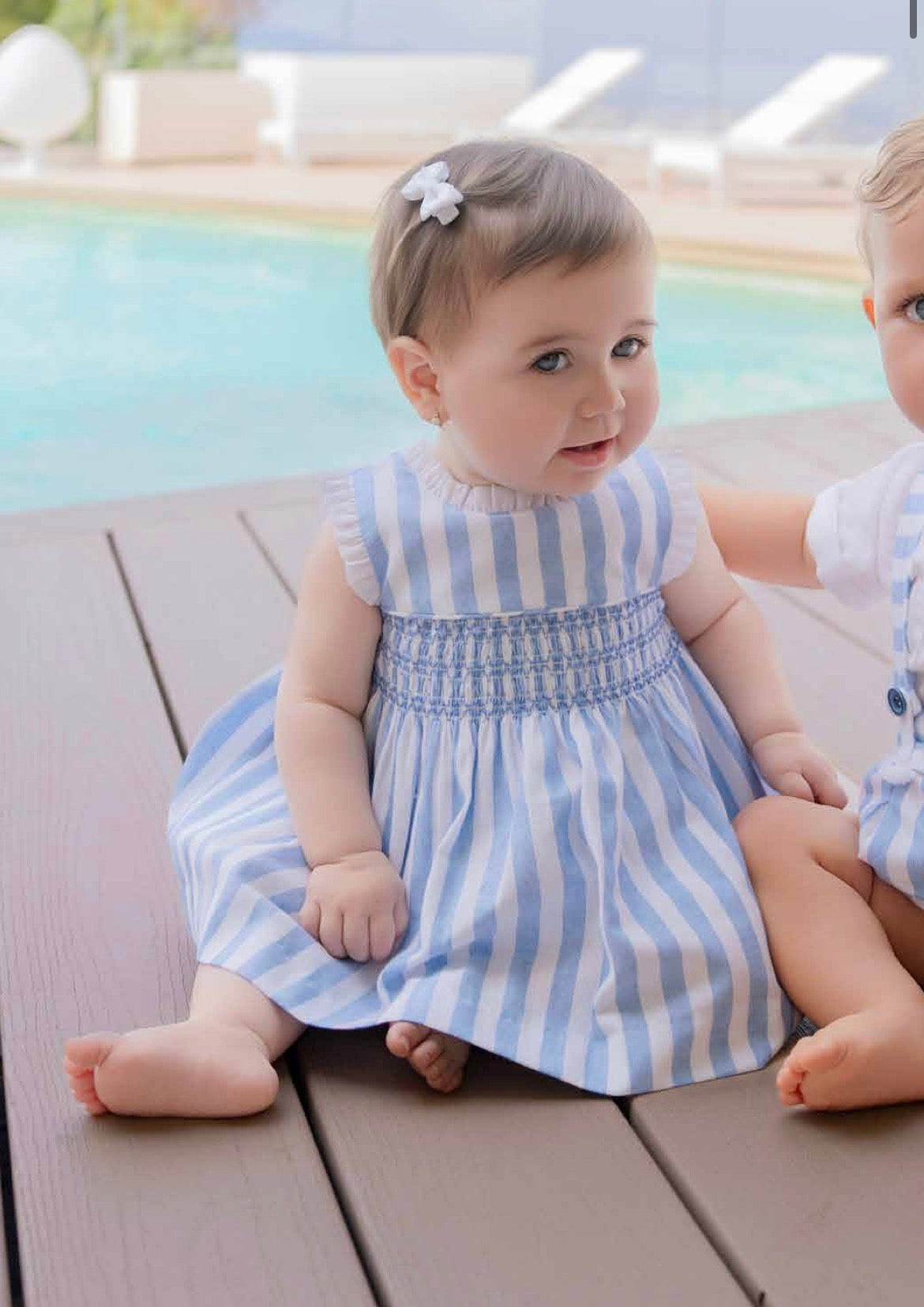 Conjunto de vestido y braga, con rayas azules y blanca